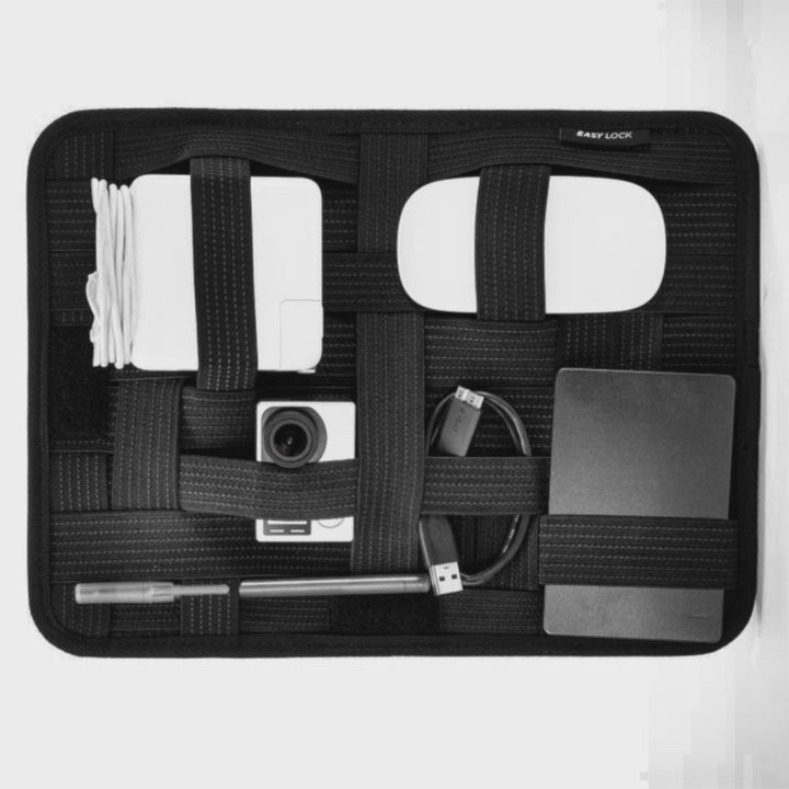 Sichere und organisiere all deine Kleinigkeiten mit diesem elastischen Gitter-Organizer! Das intelligente Design macht das Organisieren einfach und macht Spaß. Elastische Bänder greifen Stifte, Kopfhörer, Ladegeräte, Netzteile usw. Inklusive Gesäßtasche mit Eckschutz für iPad oder Tablet EasyLock-Patch mit Klettverschluss zur Befestigung in Ihrem Pendlerrucksack. Schlankes, stapelbares Design erleichtert das Einlegen oder Entfernen aus jeder Tasche. Ideal für Home-Office und Reisen.